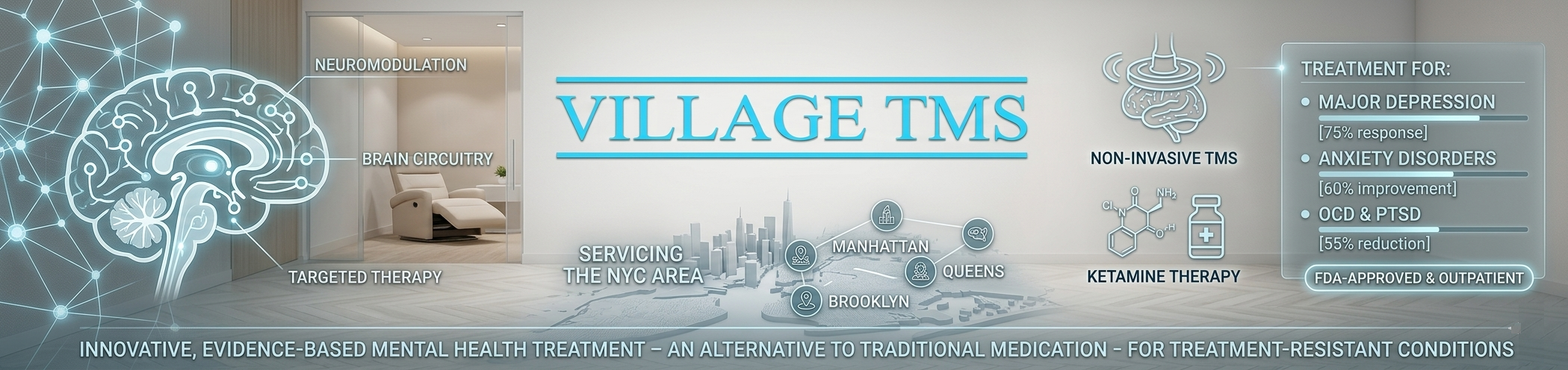 Village TMS is a New York City-based mental health clinic specializing in non-medication treatment options for depression, anxiety, and related mood disorders. The clinic offers FDA-cleared Transcranial Magnetic Stimulation (TMS) therapy and ketamine infusion therapy, administered by an experienced clinical team committed to personalized, evidence-based psychiatric care. Village TMS serves patients across the New York metropolitan area who are seeking effective alternatives to traditional antidepressant medications, including those with treatment-resistant depression and other complex mental health conditions. The clinic’s mission is to improve mental health outcomes by combining the latest advances in neuroscience with compassionate, individualized patient support.